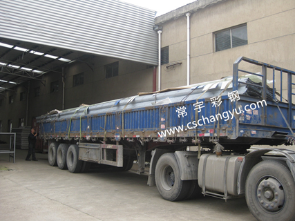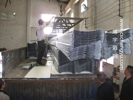 图为长沙常宇彩钢直立锁边65/430铝镁锰板出货:板长达15米。颜色白银灰。